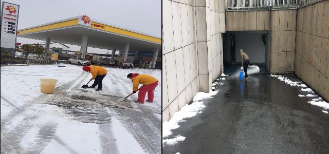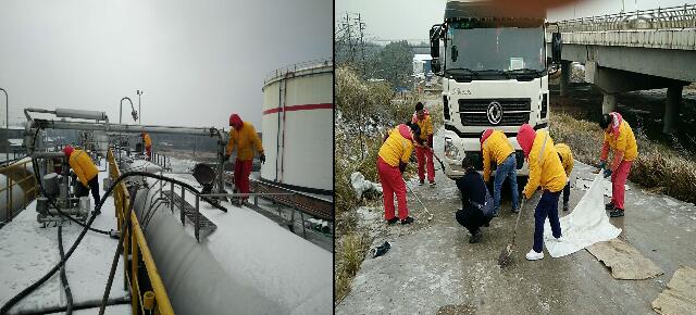 寒風中,油庫一線員工為維護正常卸、發(fā)油而冒雪工作,檢查設施設備狀態(tài);物流車隊司機們風雪無阻,排除困難,按時按點將油品安全送達客戶、送到各站點;各個加油站基層員工通力合作,掃除油站積雪,保障油站進出通道順暢通行和行車安全;總部行政、物業(yè)人員也及時給辦公樓前坪進行掃雪、除冰,為行政辦公工作保駕護航。